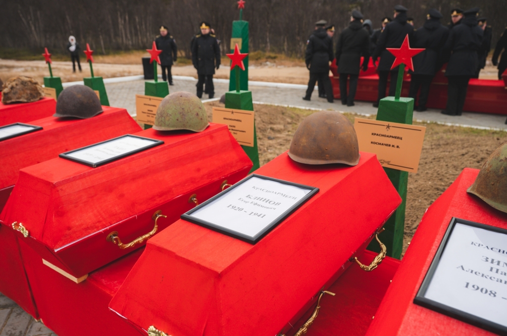 В этом году поисковыми группами на территории Мурманской области обнаружены останки 52-х воинов, тех, которые отдали свою жизнь, защищая Кольское Заполярье. 14 сентября на воинском мемориальном кладбище Алакуртти были преданы земле 10 бойцов.