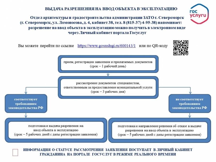 Отдел архитектуры и градостроительства администрации ЗАТО г. Североморск напоминает: получить необходимые услуги, в том числе разрешение на ввод объекта в эксплуатацию, можно не выходя из дома - через gosuslugi.ru.