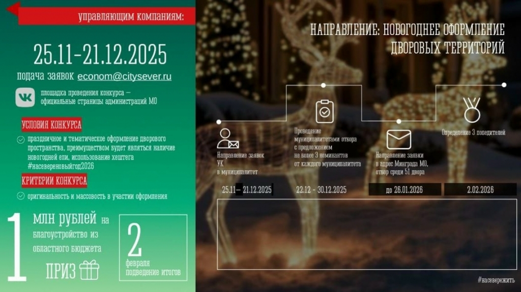 Завершается прием заявок на участие в муниципальном конкурсе праздничного украшения «Новогоднее настроение». Крайний день - 21 декабря! Победители будут направлены на региональный этап. Главный приз - 1 млн рублей!