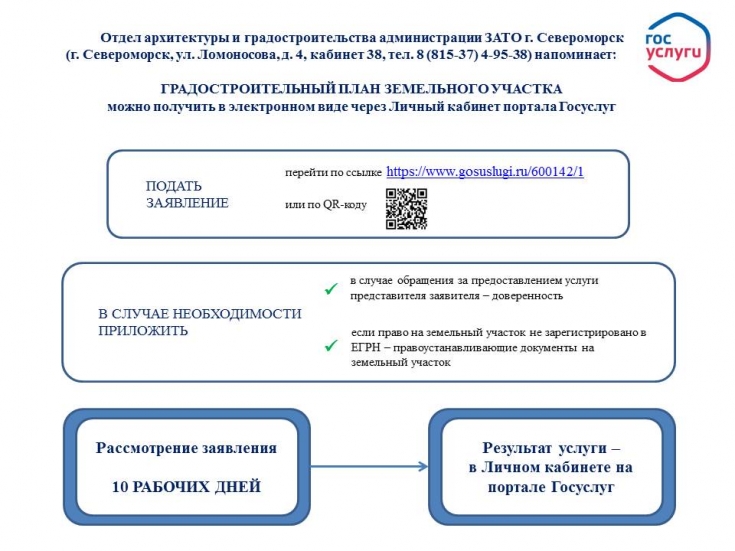 Отдел архитектуры и градостроительства администрации ЗАТО г. Североморск напоминает: градостроительный план земельного участка можно получить в электронном виде через Личный кабинет на портале «Госуслуги».