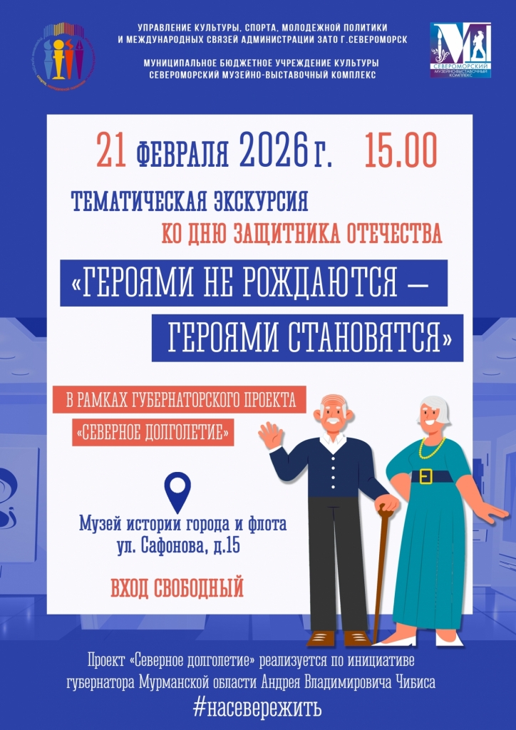 ➣ 21 февраля в 15.00 в музее истории города и флота СМВК в рамках губернаторского проекта «Северное долголетие» пройдет экскурсия для людей старшего поколения «Героями не рождаются – героями становятся». Гостей проведут по залу героев-североморцев, где представлена история Великой Отечественной войны 1941-1945 гг. в Заполярье и материалы, посвященные самоотверженности, героизму и мужеству, проявленным российскими военнослужащими и добровольцами в ходе специальной военной операции.