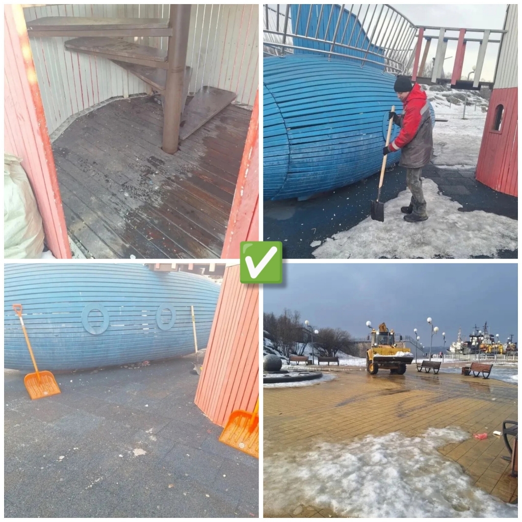 ✓ очистили от снега детскую площадку на Приморской площади, убрали мусор и отремонтировали игровой элемент;