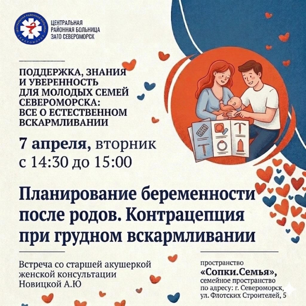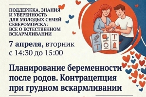 - с 14:30 до 15:00 - лекция старшей акушерки женской консультации Новицкой А.Ю. на тему: «Планирование беременности после родов. Контрацепция при грудном вскармливании»;