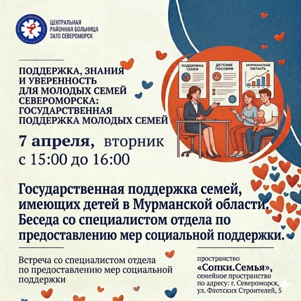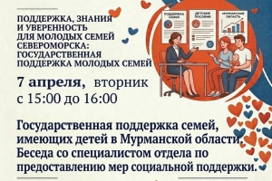 - с 15:00 до 16:00 - беседа со специалистом отдела по предоставлению мер социальной поддержки на тему: «Государственная поддержка семей, имеющих детей в Мурманской области» - речь пойдет о выплатах и льготах, мерах поддержки семей с детьми.