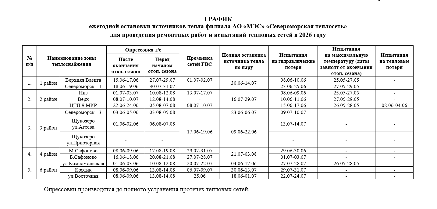 График ежегодной остановки источников тепла филиала АО «МЭС» «Североморская теплосеть» для проведения ремонтных работ и испытаний тепловых сетей в 2026 году.