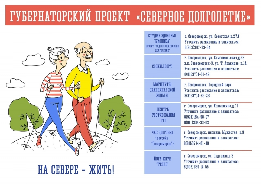 В Мурманской области по поручению губернатора Андрея Чибиса реализуется проект «Северное долголетие», направленный на улучшение качества жизни старшего поколения. Публикуем адреса учреждений и организаций, участвующих в проекте.