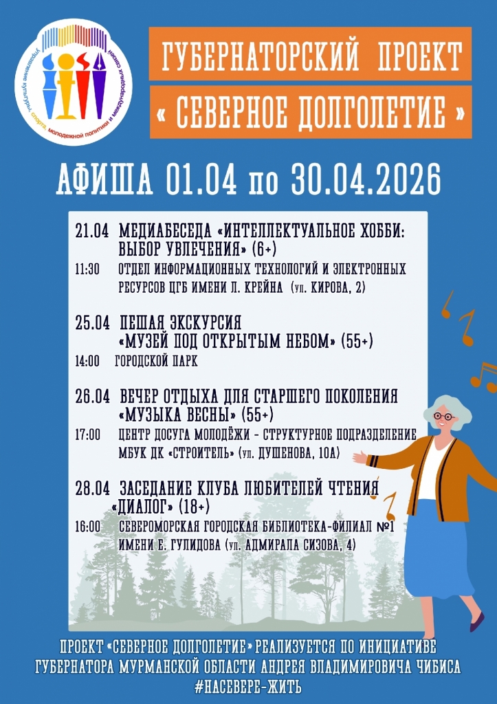 В Мурманской области по поручению губернатора Андрея Чибиса реализуется проект «Северное долголетие», направленный на улучшение качества жизни старшего поколения. Публикуем адреса учреждений и организаций, участвующих в проекте.