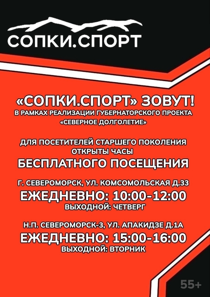 - тренажерный зал - «СОПКИ.СПОРТ» (г. Североморск, ул. Комсомольская, 33; нп Североморск-3, ул. Тимура Апакидзе, 1), каждое воскресенье с 15.00 до 16.00;