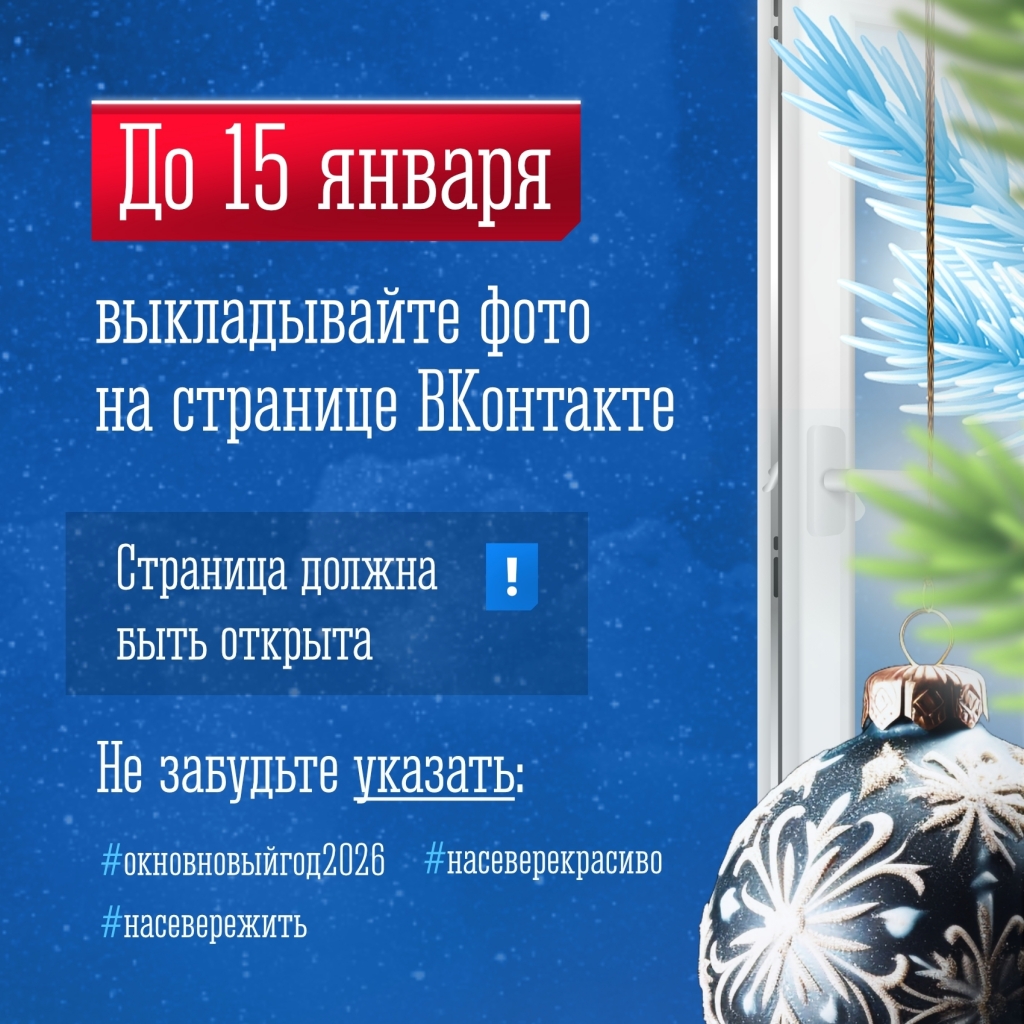 3. Выложить пост на своей странице в ВК до 15 января (страница должны быть открытой), указать #окновновыйгод2026, #насеверекрасиво, #насевережить.