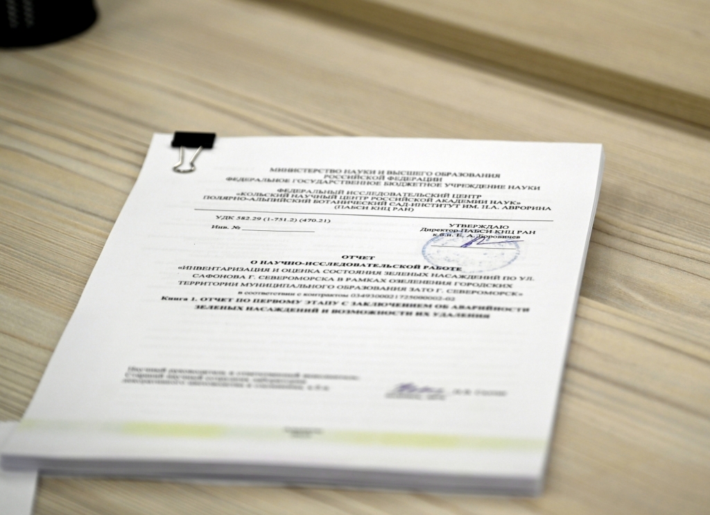 Глава ЗАТО Североморск Владимир Евменьков и директор Полярно-альпийского ботанического сада-института им. Н.А. Аврорина Евгений Боровичев обсудили итоги первого этапа научно-исследовательской работы по инвентаризации и оценке состояния зеленых насаждений по ул. Сафонова.