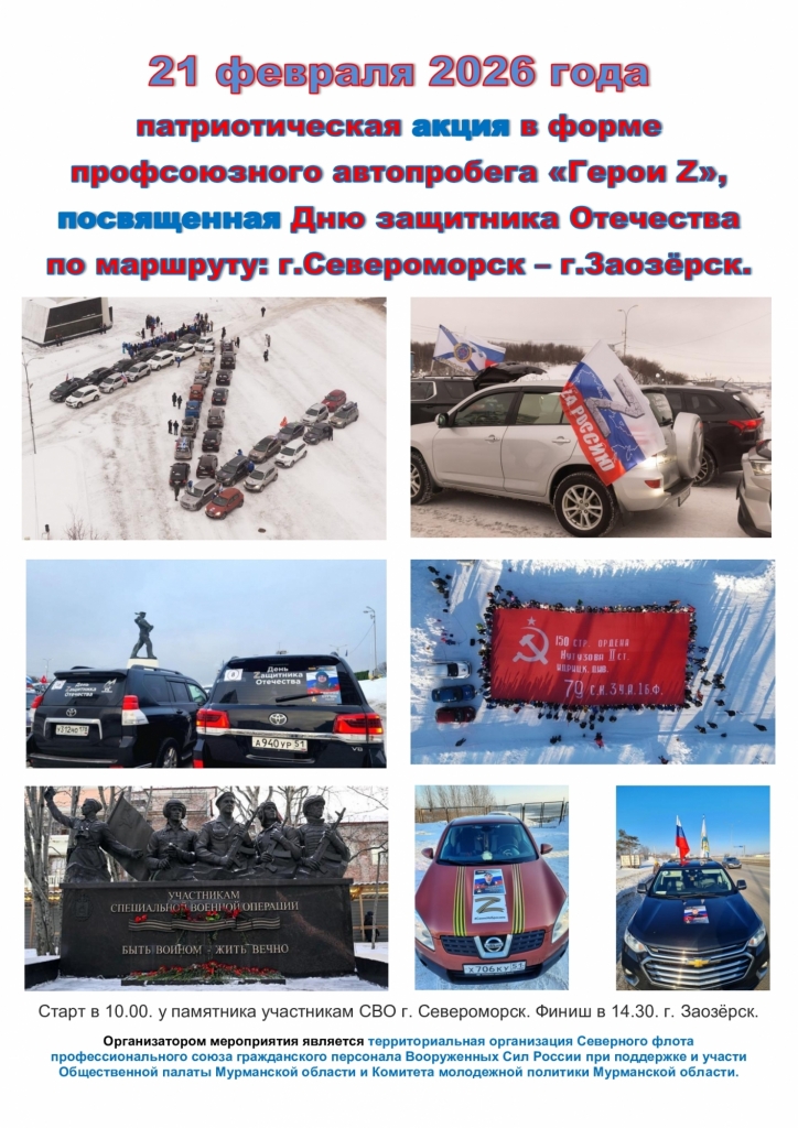 ➣Так, в Североморске 21 февраля в 10.00 в сквере у памятника участникам специальной военной операции стартует автопробег «Герои Z», который проводит территориальная организация Северного флота Профсоюза гражданского персонала ВС РФ при поддержке Комитета молодежной политики Мурманской области и участии общественных организаций региона. Экипажи отправятся по маршруту Североморск - Мурманск - Заозерск.