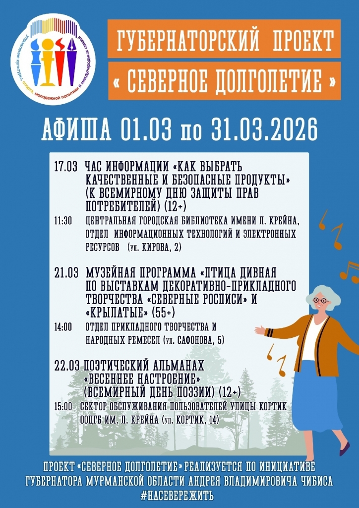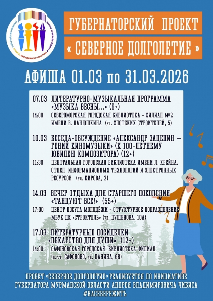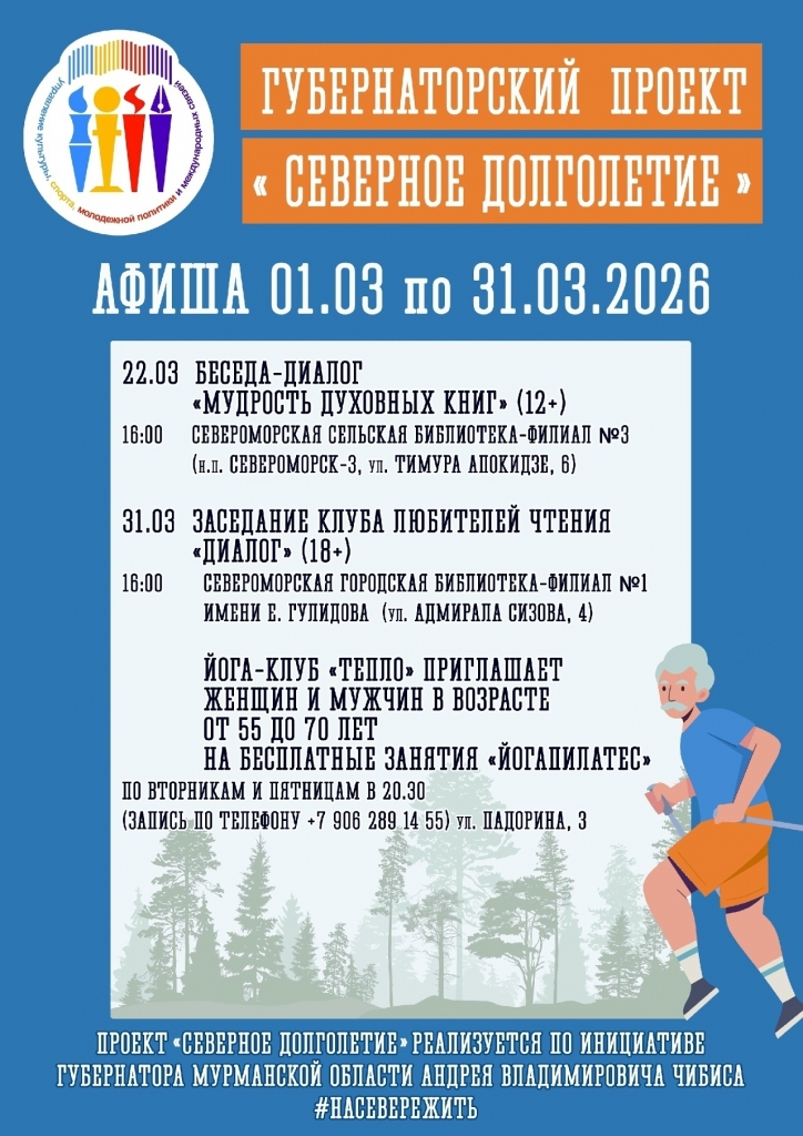 Мероприятия по трудоустройству и обучению, спорту и активности, культуре и досугу, волонтерству и наставничеству, компьютерной и цифровой грамотности, медицине и социальной поддержке: в Мурманской области продолжается реализация губернаторского проекта «Северное долголетие».