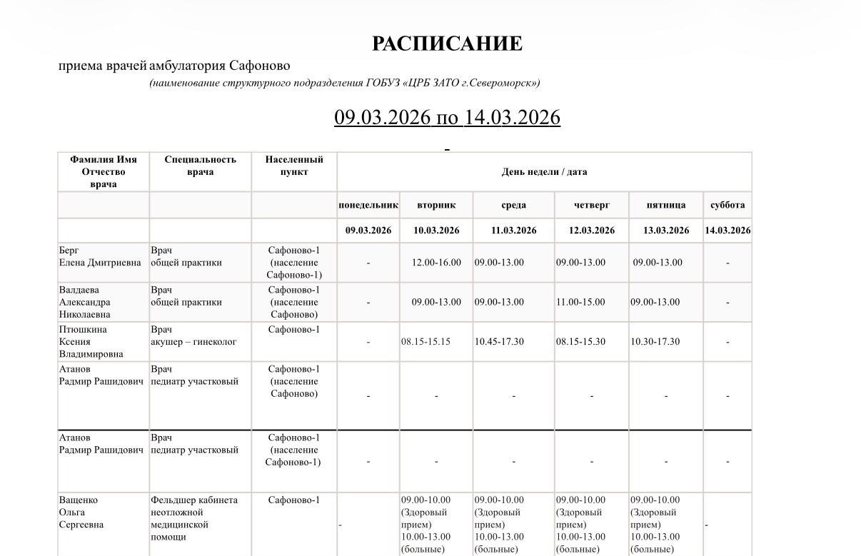 Пока программисты работают над новой интернет-страницей Североморской ЦРБ, больница сообщает график работы детской поликлиники и амбулатории пгт Сафоново по 14 марта.