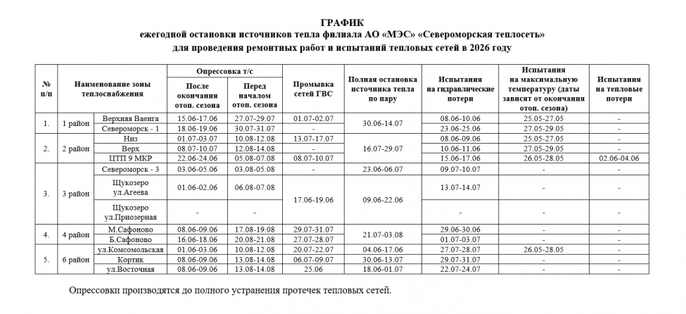 График ежегодной остановки источников тепла филиала АО «МЭС» «Североморская теплосеть» для проведения ремонтных работ и испытаний тепловых сетей в 2026 году.