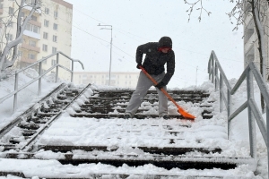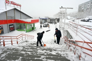 Весенний снегопад - это красиво, но требует усиленной работы от коммунальных служб. Управляющие оргнанизации и подрядчики, отвечающие за содержание улично-дорожной муниципальной сети и пешеходных маршрутов , трудятся несмотря на циклон и выходной день.