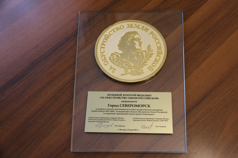 ЗАТО г. Североморск за реализацию Культурно-патриотической программы «Знамя Победы 2015-2020» удостоен золотой медали "За обустройство Земли Российской". Дорогую награду главе администрации ЗАТО г. Североморск Ирине Нориной вручил Вячеслав Бочаров, председатель проекта «Знамя Победы 2015-2020».