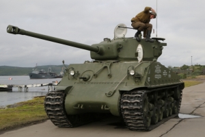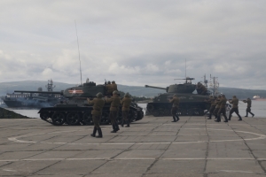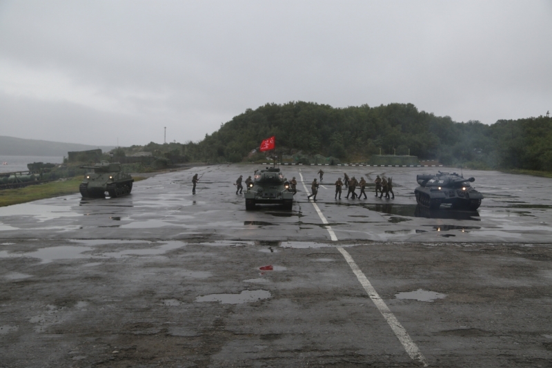 В представлении, разыгранном воинами-североморцами Северного флота на побережье губы Грязная, приняли участие исторические боевые машины советского производства: тяжёлый танк ИС-3, лучший средний танк – легендарный Т-34 и американский «Шерман», который поставлялся в СССР по лендлизу.