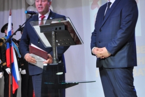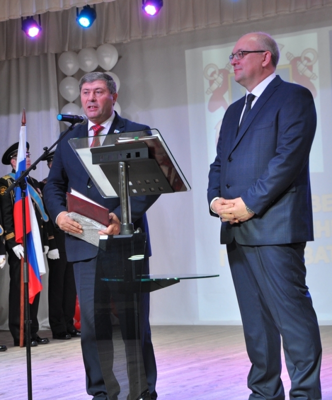 Выйдя на сцену Владимир Евменьков произнес слова присяги, которые прописаны в Уставе ЗАТО, а Евгений Алексеев вручил ему удостоверение Главы ЗАТО г. Североморск.