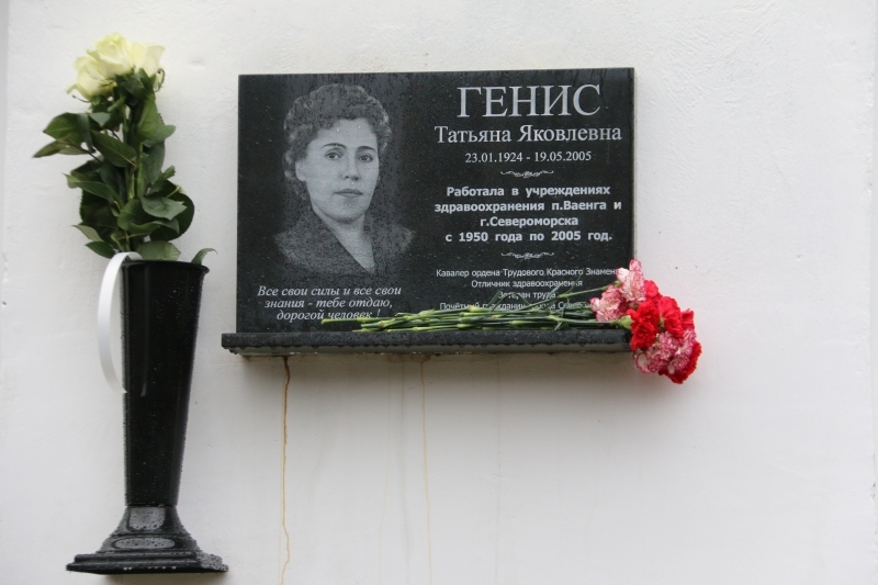 Татьяна Яковлевна Генис — врач-методист по контролю качества лечения и обследования больных Североморской районной больницы. 1 апреля 1950 года по приказу Мурманского облздравотдела Т.Я. Генис организовала станцию скорой помощи в поселке Ваенга, возглавила ее и более 7 лет была и заведующей, и единственным врачом, и консультантом для фельдшеров. В сентябре 1957 года в Североморске вступила в строй вновь отстроенная больница на 125 коек с поликлиникой для взрослых. После соответствующей подготовки Татьяна Яковлевна перешла на работу в терапевтическое отделение сначала ординатором, а с 1968 по 1973 г.г. - заведующей отделением. Со 2 апреля 1973 г. была переведена на должность заместителя главного врача по лечебной работе Североморской районной больницы и в этой должности работала до 1 июля 1993 года. С 1 июля 1993 г. и до 2005 г. работала в должности врача - методиста по контролю качества лечения и обследования больных Североморской районной больницы.