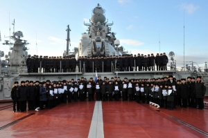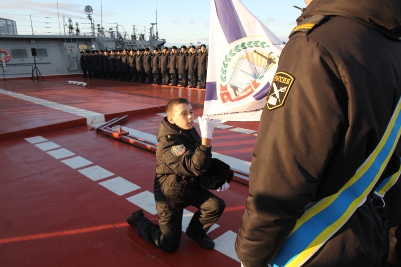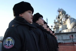 Вчера на борту флагмана Северного флота – тяжёлого атомного ракетного крейсера «Пётр Великий» состоялась торжественная церемония посвящения в кадеты учеников 5 класса североморского кадетского корпуса, подшефного штабу Северного флота. 24 мальчишки хором произнесли клятву кадета и, преклонив колено, поцеловали флаг кадетского корпуса.