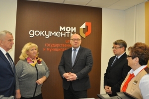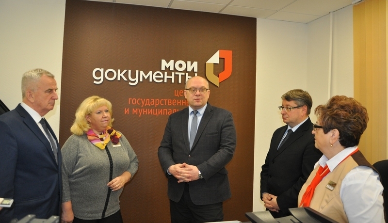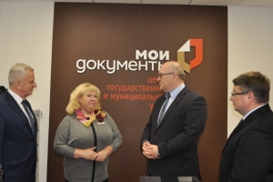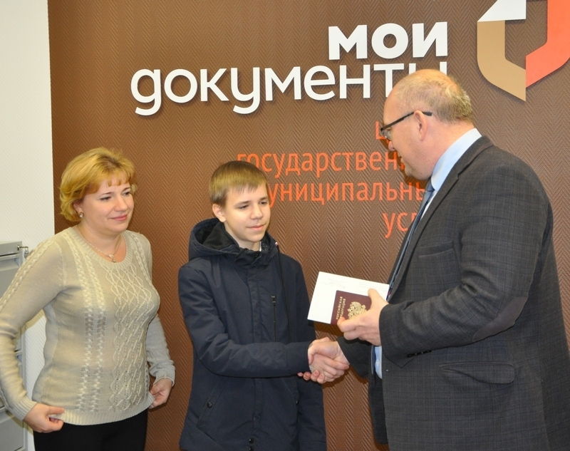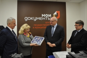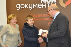 В этом зале прошла церемония вручения Владимиром Евменьковым паспорта Александру Новикову, которому он кроме главного документа вручил и памятный подарок. А для зала ожидания МФЦ Глава ЗАТО передал настенные часы с символикой флотской столицы.