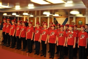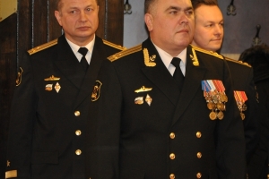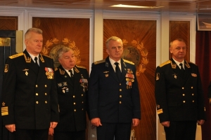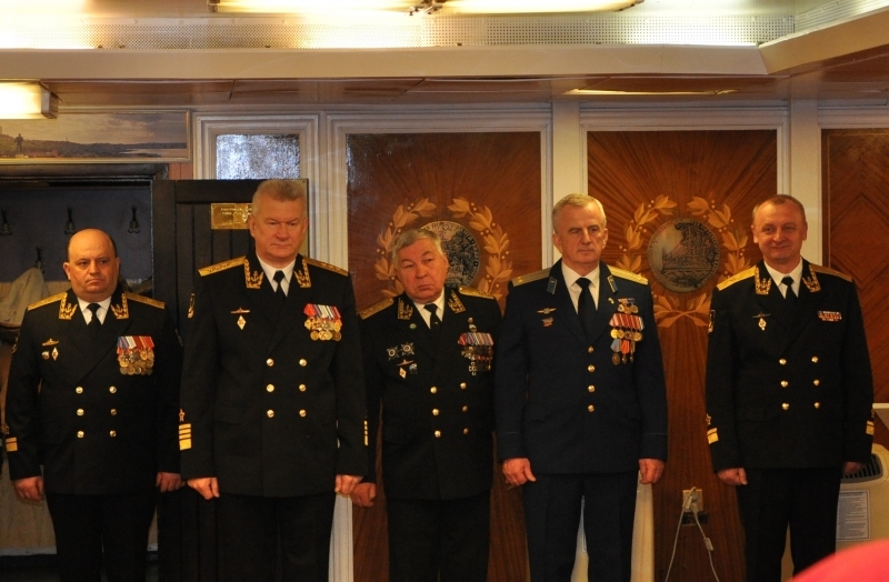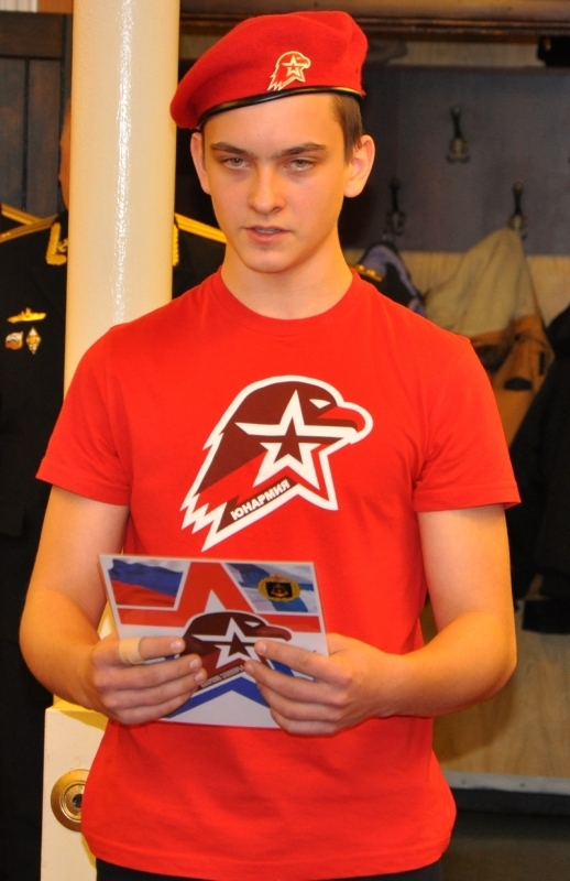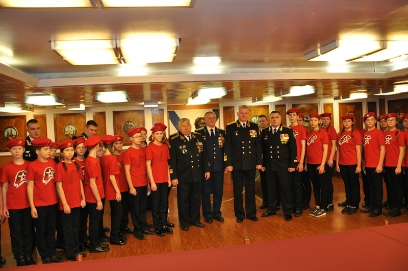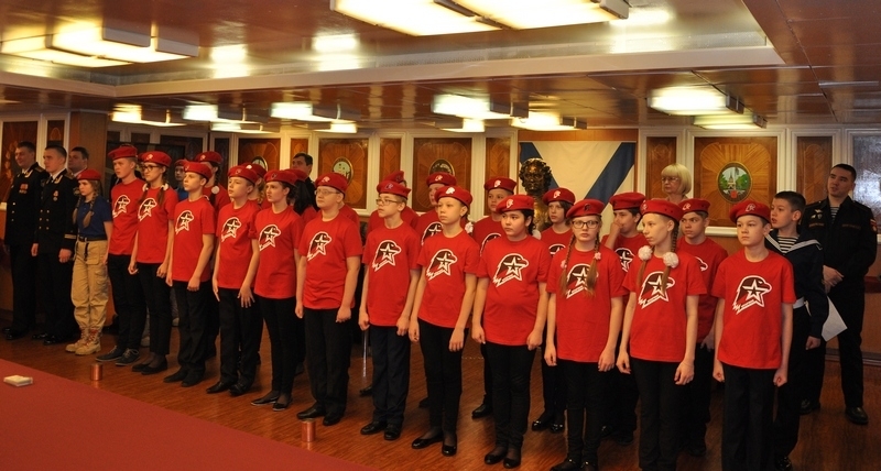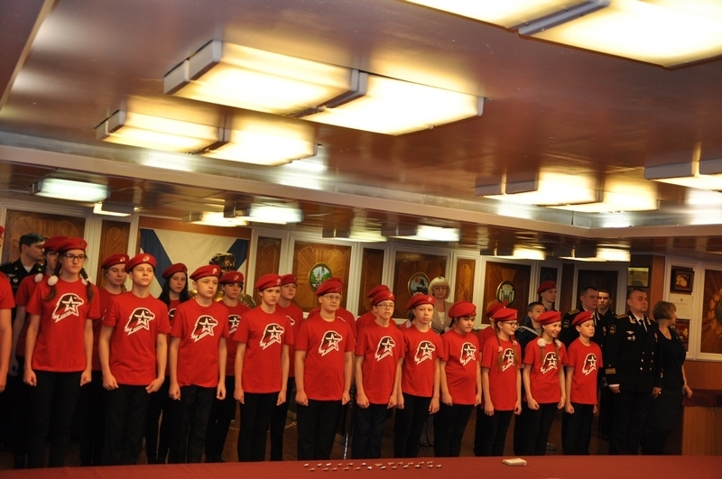 В кают компании в присутствии комундующего Северного флота адмирала Николая Евменова, вице-адмирала в оставке Юрия Бояркина, председателя Совета депутатов ЗАТО г. Североморск подполковника в отставке Евгения Алексеева, адмиралов и офицеров Северного флота и экипажа крейсера клятву юнармейцев произнесли ребята средних школ №5,8и 9.
