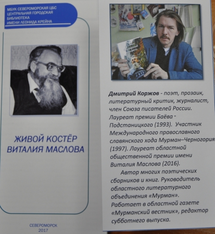24 февраля книга писателя, поэта, журналиста, литературного критика Дмитрия Коржова «Несмиренный живописец» пришла багажом в Мурманск, в этот же день она была передана вдове Виталия Семеновича Маслова – Валентине Устиновне, а на следующий день, 25 февраля, в Североморской Центральной городской библиотеке в рамках третьей творческой встречи «Открытие книги», состоялась ее презентация, на которую пришли почитатели творчества молодого, но уже признанного писателя, его друзья и коллеги по литературному творчеству.