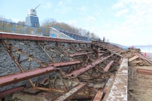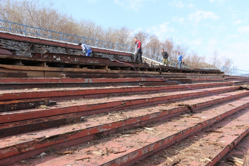 Следующая остановка – Приморская площадь. Здесь проводится реконструкция трибун. За 30 с лишним лет капитально трибуны ни разу не ремонтировали. Каждый год перед праздником освежали краску, чинили повреждённые скамейки. Теперь нужна полная реконструкция. Согласно проекта производства строительных работ, в ближайшее время, будет проведен демонтаж несущих конструкций, вместо них изготовят железобетонное основание и пенополиуретановое покрытие. Вместо деревянных скамеек установят современные пластиковые антивандальные сиденья на 1086 мест и еще 9 для людей с ограниченными возможностями. Срок окончания строительно-монтажных работ – 16 июля 2018 года.