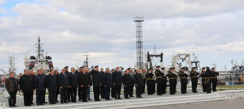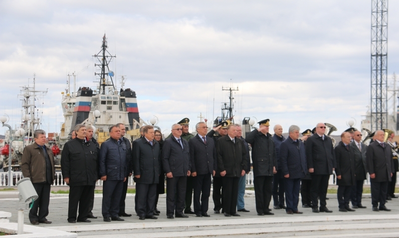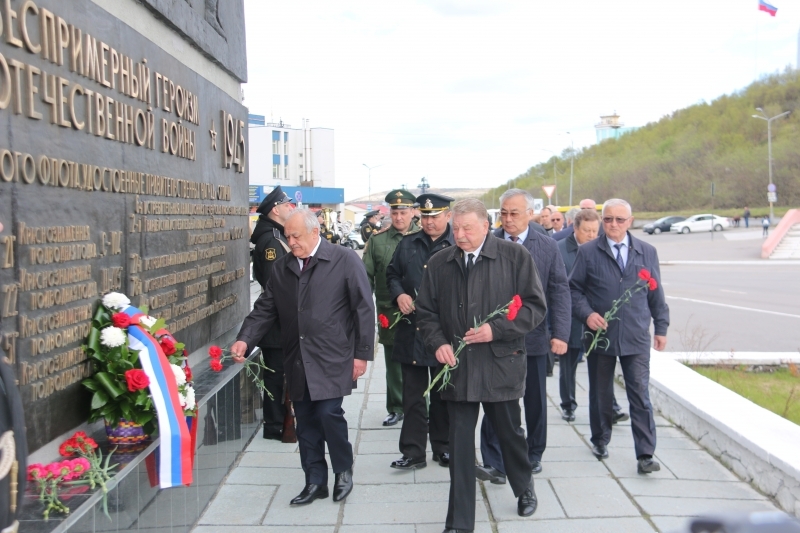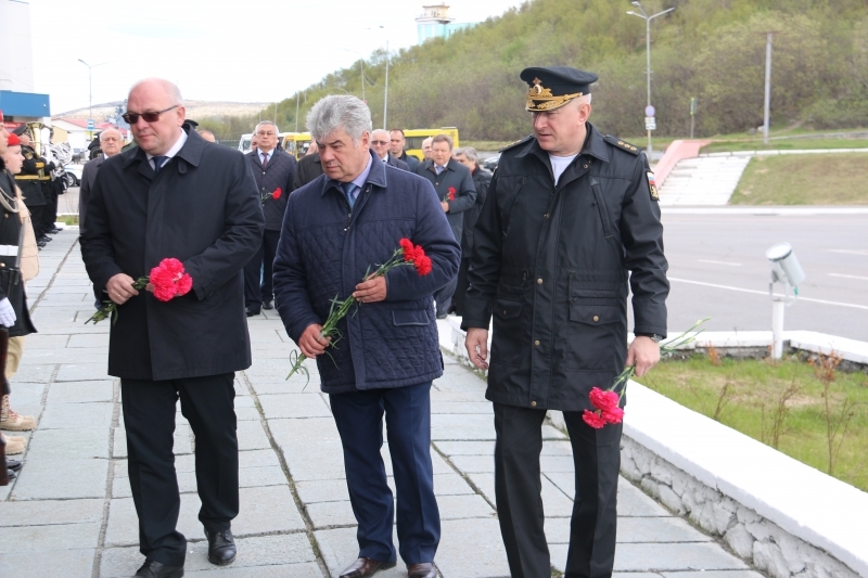 На Приморской площади представители Совета Федерации совместно с командующим Северным флотом адмиралом Николаем Евменовым и Главой ЗАТО г. Североморск Владимиром Евменьковым возложили цветы к памятнику «Героям-североморцам, защитникам Советского Заполярья».