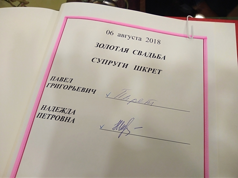 Торжественная церемония прошла для супружеской пары, как и полвека назад. Были и свадебный марш, и обмен золотыми кольцами, и волнение. Юбилей совместной жизни они отметили накануне, 6 августа. Познакомились и поженились молодые в Ачинске Красноярского края, в 1968 году приехали в Североморск. Она - учитель начальных классов, 9 школе Североморска отдала 43 года жизни. Он - военный, офицер, служил в авиаполке. Ухаживал Павел Григорьевич за своей избранницей красиво, несмотря на то, что жили они в одном городе, каждый день писал письма. Эти романтические послания в семье Шкрет до сих пор бережно хранят.