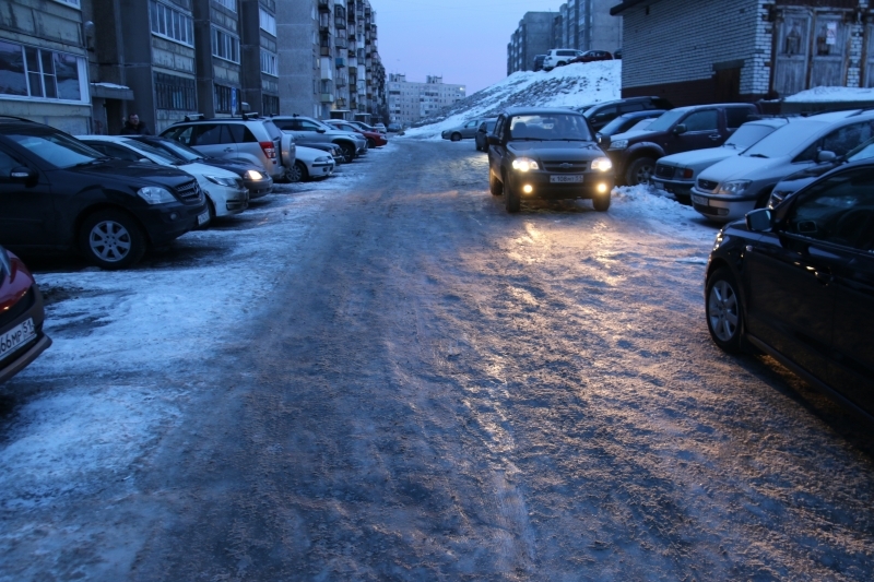 Проверили обстановку участники рейда и во дворах на улице Инженерной, в районе домов 1 и 3 крутой обледенелый спуск на который не смог подняться даже служебный автомобиль компании ООО «СЖКХ».