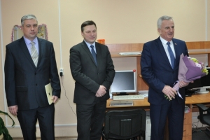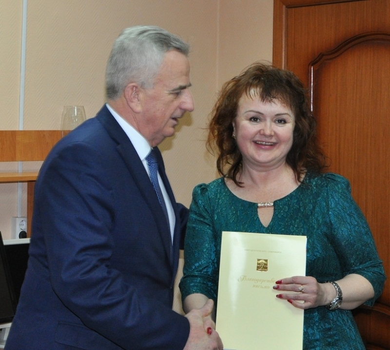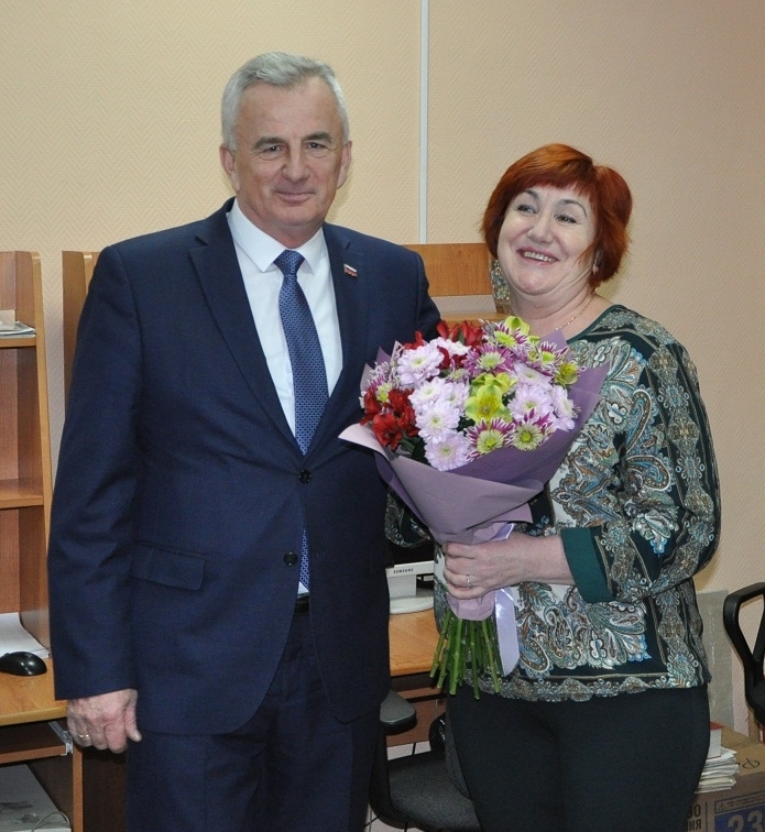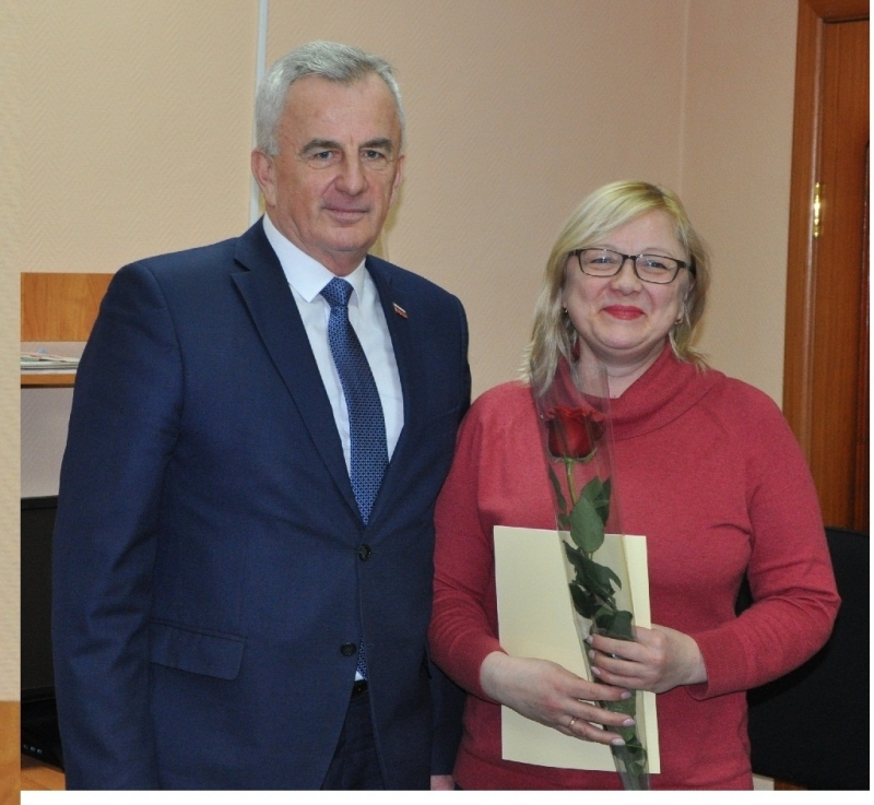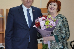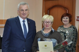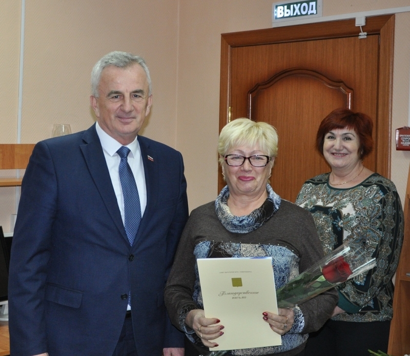 Евгений Алексеев вручил Благодарственные письма Совета депутатов ЗАТО г. Североморск Ольге Воробьевой, собственному корреспонденту, Светлане Сергеевой, корректору и Галине Горовенко заведующей бюро проверки газеты «Североморские вести», а главному редактору газеты Марине Грабаровской букет цветов.