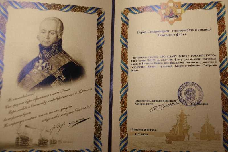 За служение флоту, значимый вклад в Великую Победу, умножение, развитие и сохранение боевых традиций Краснознаменного Северного флота город Североморск – главная база и столица Северного флота награжден общественным орденом "Во славу флота российского" первой степени.