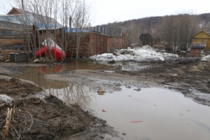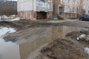 Главе ЗАТО г.Североморск Владимиру Евменькову поступила жалоба от жителей дома №15 по ул.Гвардейской на большую лужу, которая преграждает им единственный путь к дому.