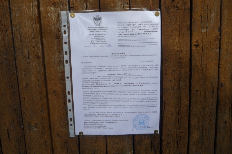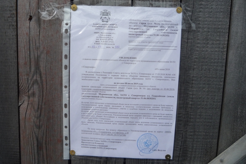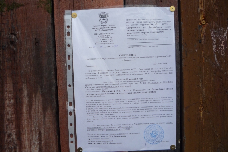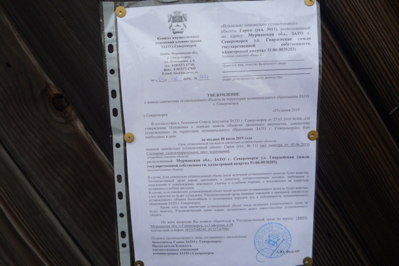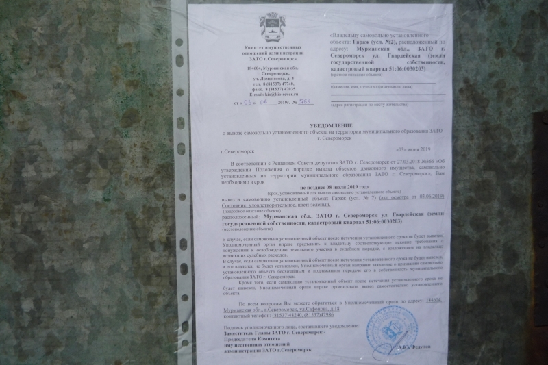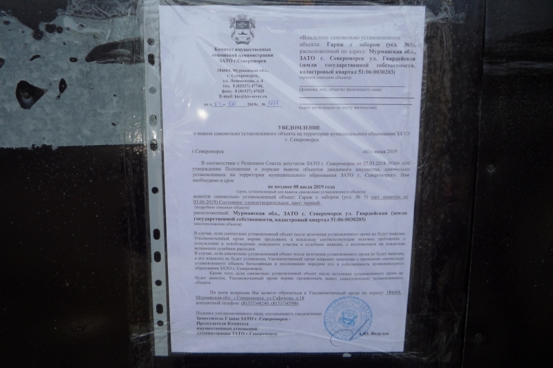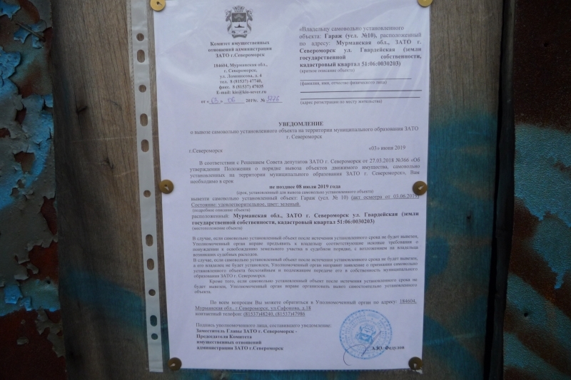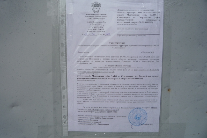 Убедительно просим вас в кратчайшие сроки вывезти самовольно установленные объекты, расположенные по адресу: Мурманская обл., ЗАТО г. Североморск ул. Гвардейская (земли государственной собственности, кадастровый квартал 51:06:0030203).