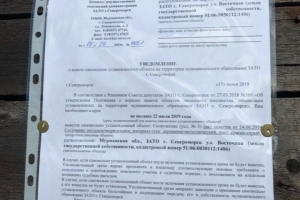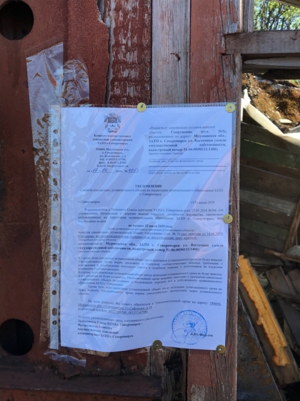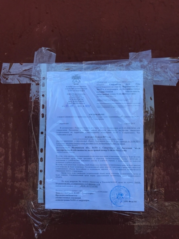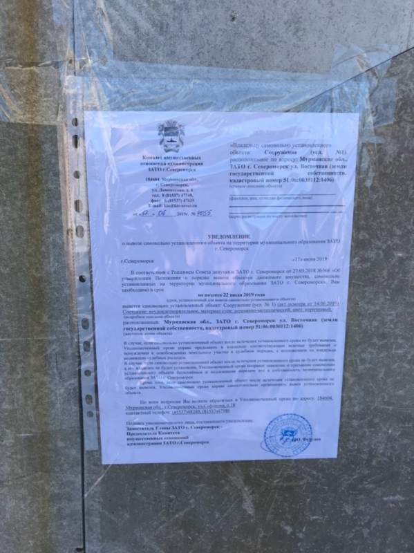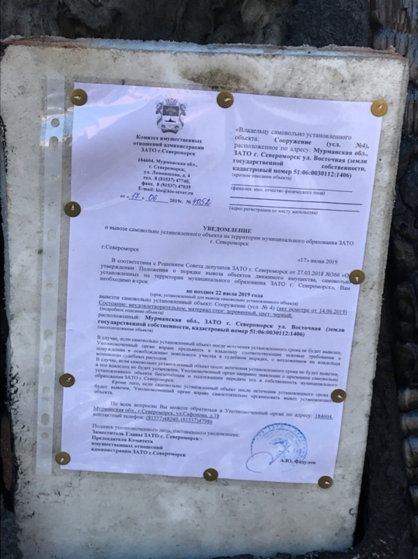 Уважаемые владельцы объектов, расположенных по адресу: Мурманская обл., ЗАТО г, Североморск в районе д.4 по ул. Восточная (кадастровый номер 51:06:0030112:1406)! Убедительно просим вас в кратчайшие сроки вывезти самовольно установленные объекты, расположенные по адресу: Мурманская обл., ЗАТО г, Североморск в районе д.4 по ул. Восточная (кадастровый номер 51:06:0030112:1406). В случае, если самовольно установленные объекты не позднее 18 июля 2019 года не будут вывезены, Уполномоченный орган администрации ЗАТО г.Североморск вправе самостоятельно организовать вывоз данных объектов. В дальнейшем Уполномоченный орган администрации ЗАТО г.Североморск имеет право предъявить владельцам самовольно установленных сооружений требование о необходимости возмещения расходов, связанных с демонтажем и вывозом самовольно установленных сооружений, включая расходы по транспортировке, хранению, а также восстановлению благоустройства земельного участка, на котором в настоящее время расположены сооружения. Уведомления о вывозе самовольно установленных объектов, владельцы которых не известны, 17.06.2019 размещены на объектах. Комитет имущественных отношений администрации ЗАТО г.Североморск сообщает о необходимости владельцам вышеуказанных самовольно установленных объектов срочно обратиться в Комитет по адресу: 184604, Мурманская обл., г.Североморск, ул.Сафонова, д.18 каб.3, каб.4, контактный телефон: (81537)48240, (81537)47986. |