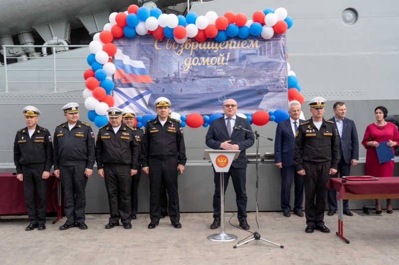 Владимир Евменьков поздравил североморцев, принимавших участие в дальнем походе, с возвращением домой. Командиру фрегата «Адмирал Флота Советского Союза Горшков» и капитанам судов обеспечения, вернувшимся из похода глава ЗАТО вручил благодарственные письма, ценные подарки и памятные нагрудные знаки «Русское Заполярье».